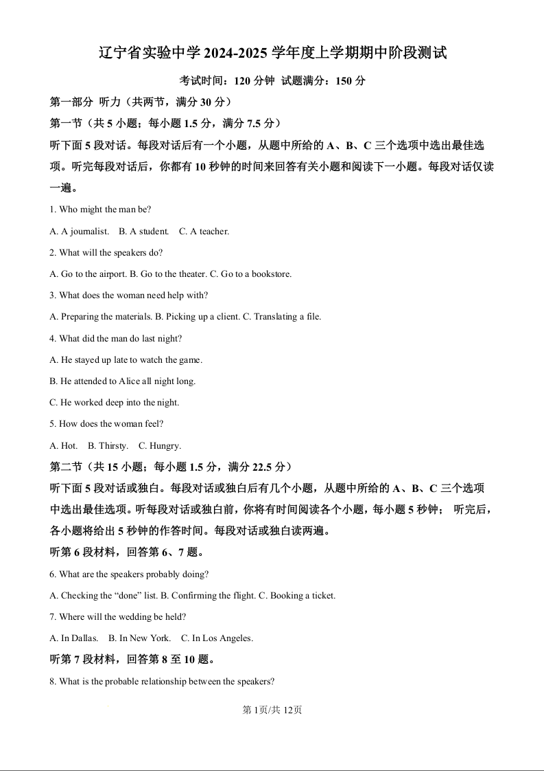 辽宁省实验中学2024-2025学年高二上学期期中考试英语(原卷版)
