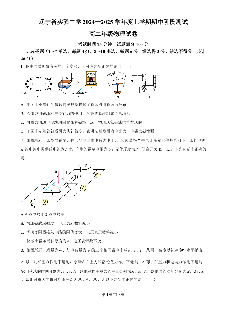 辽宁省实验中学2024-2025学年高二上学期期中考试物理(原卷版)
