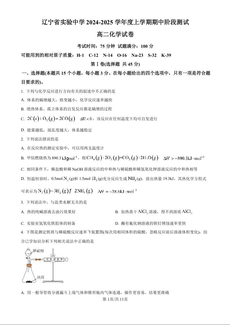 辽宁省实验中学2024-2025学年高二上学期期中考试化学(原卷版)