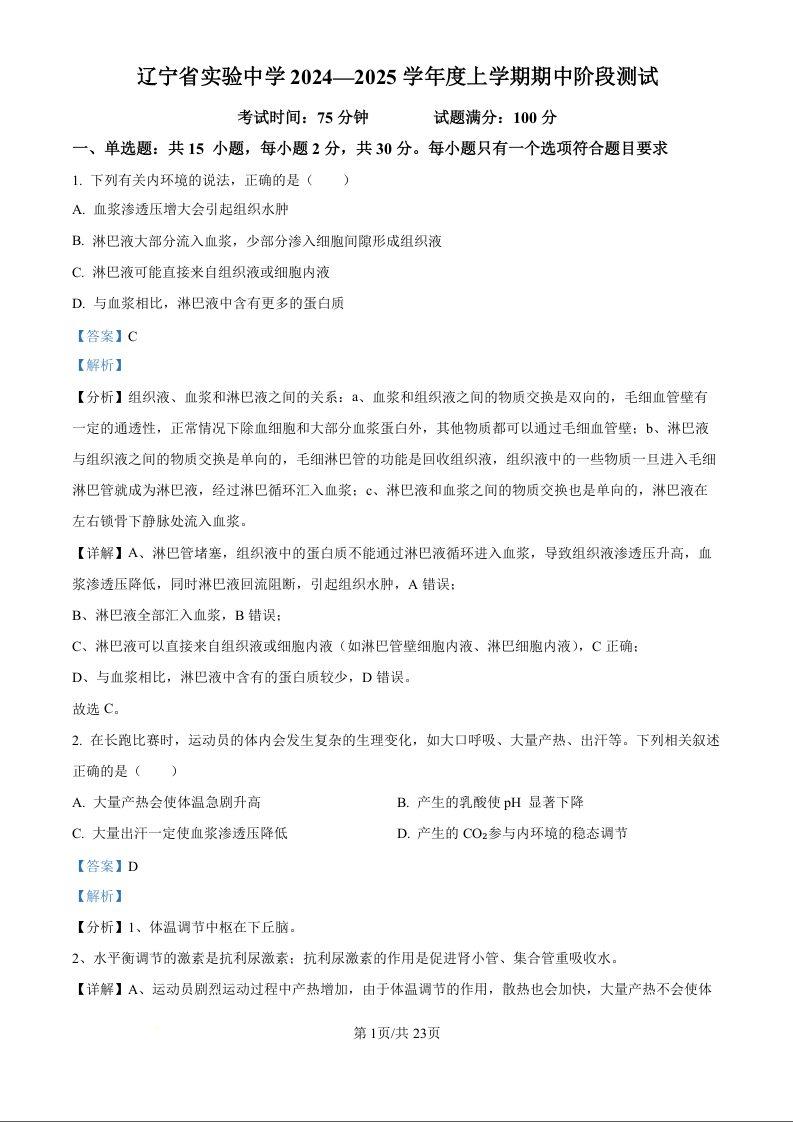 辽宁省实验中学2024-2025学年高二上学期期中考试生物(精品解析版)
