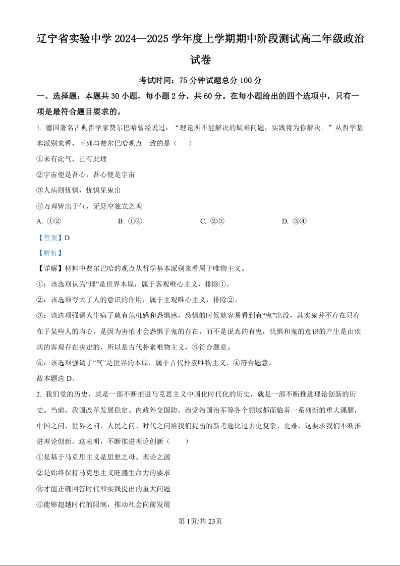 辽宁省实验中学2024-2025学年高二上学期期中考试政治(精品解析版)
