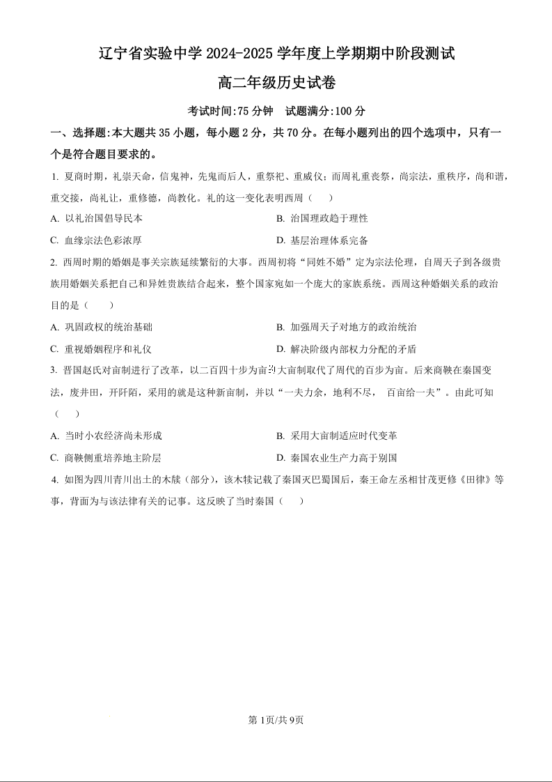 辽宁省实验中学2024-2025学年高二上学期期中考试历史(原卷版)