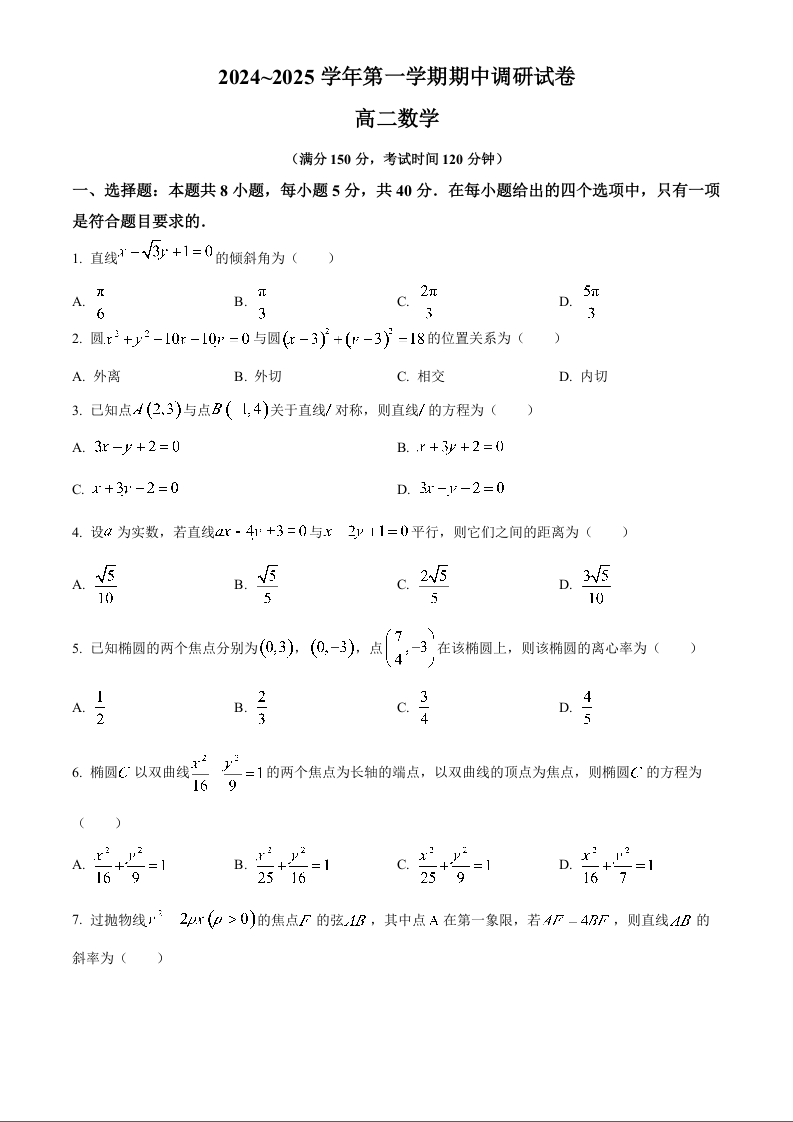 江苏省宿迁市2024-2025学年高二上学期11月期中考试数学(原卷版)