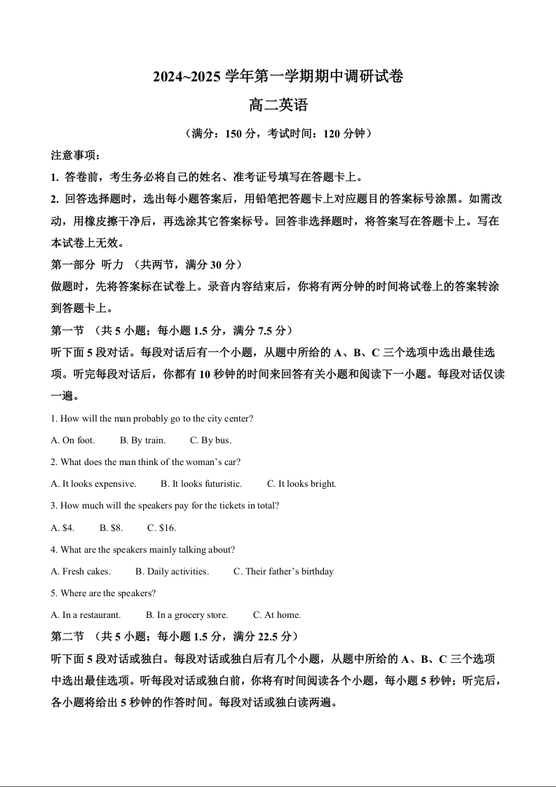 江苏省宿迁市2024-2025学年高二上学期11月期中考试英语(原卷版)