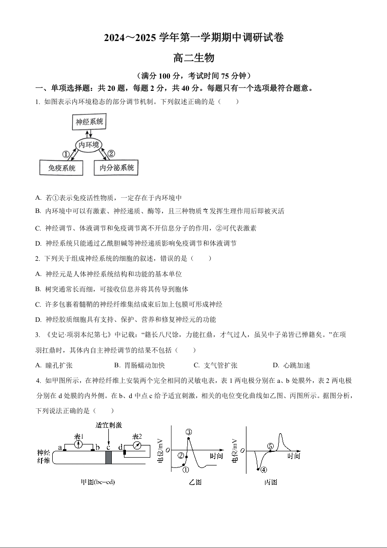 江苏省宿迁市2024-2025学年高二上学期11月期中考试生物(原卷版)