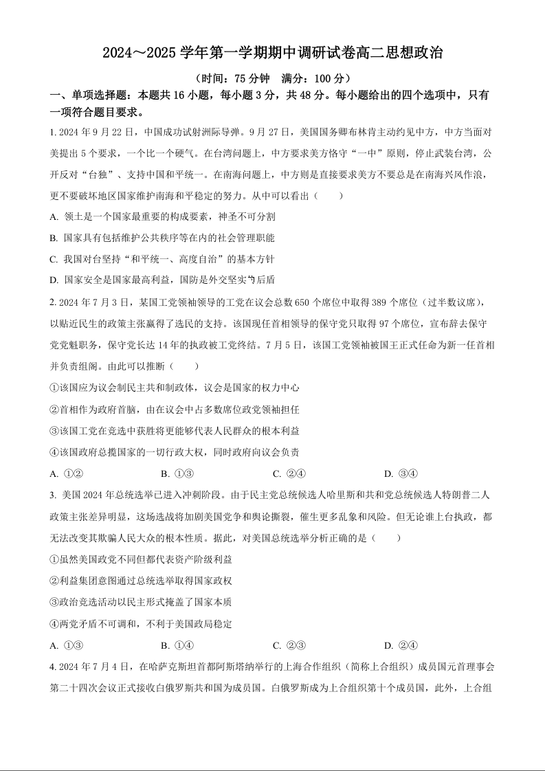 江苏省宿迁市2024-2025学年高二上学期11月期中考试政治(原卷版)