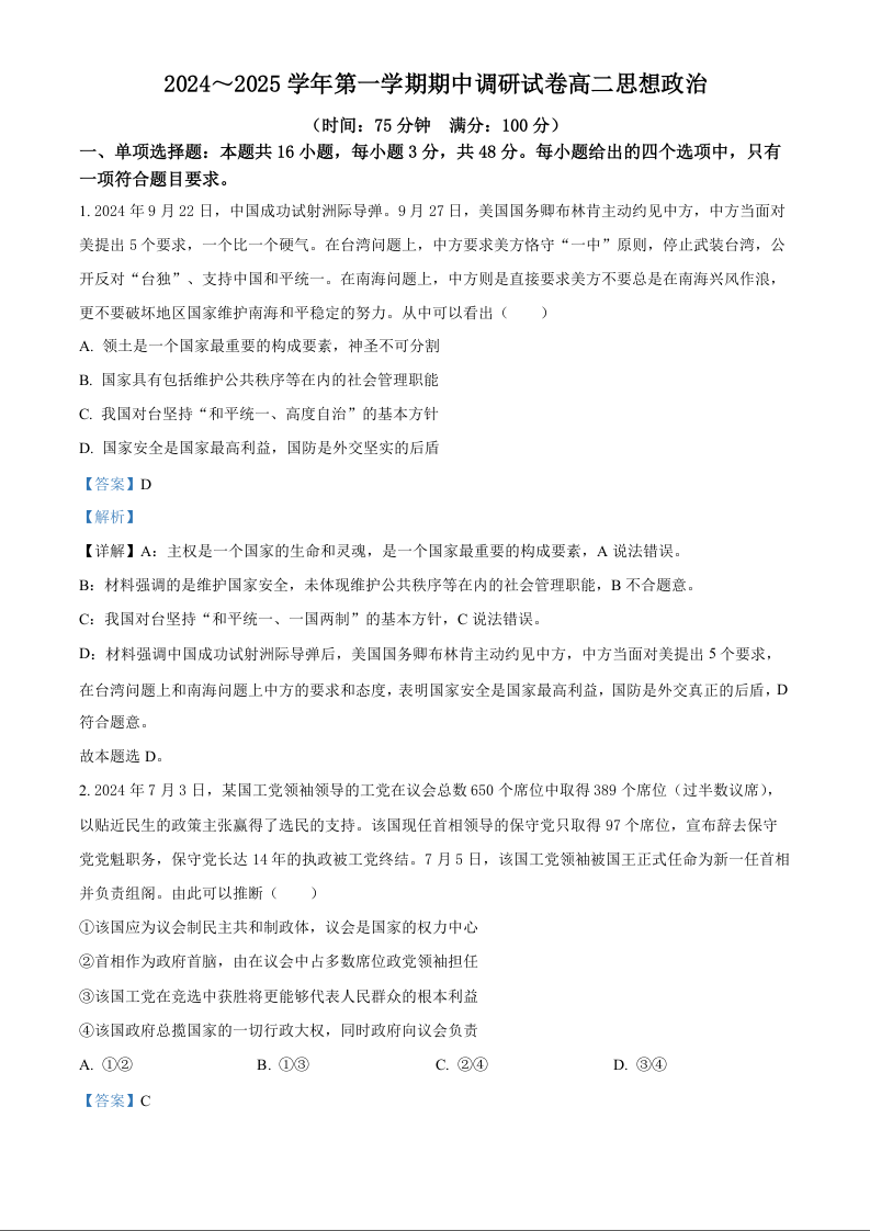 江苏省宿迁市2024-2025学年高二上学期11月期中考试政治(解析版)