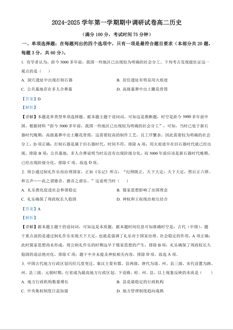 江苏省宿迁市2024-2025学年高二上学期11月期中考试历史(解析版)