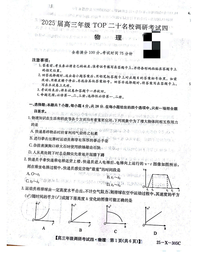 河南省TOP二十名校2025届高三上学期12月调研考试(四)物理