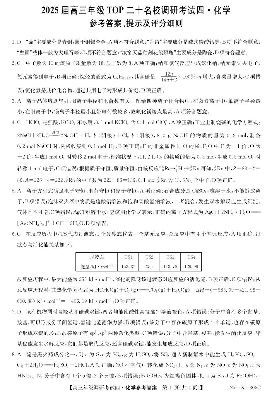 河南省TOP二十名校2025届高三上学期12月调研考试(四)化学答案