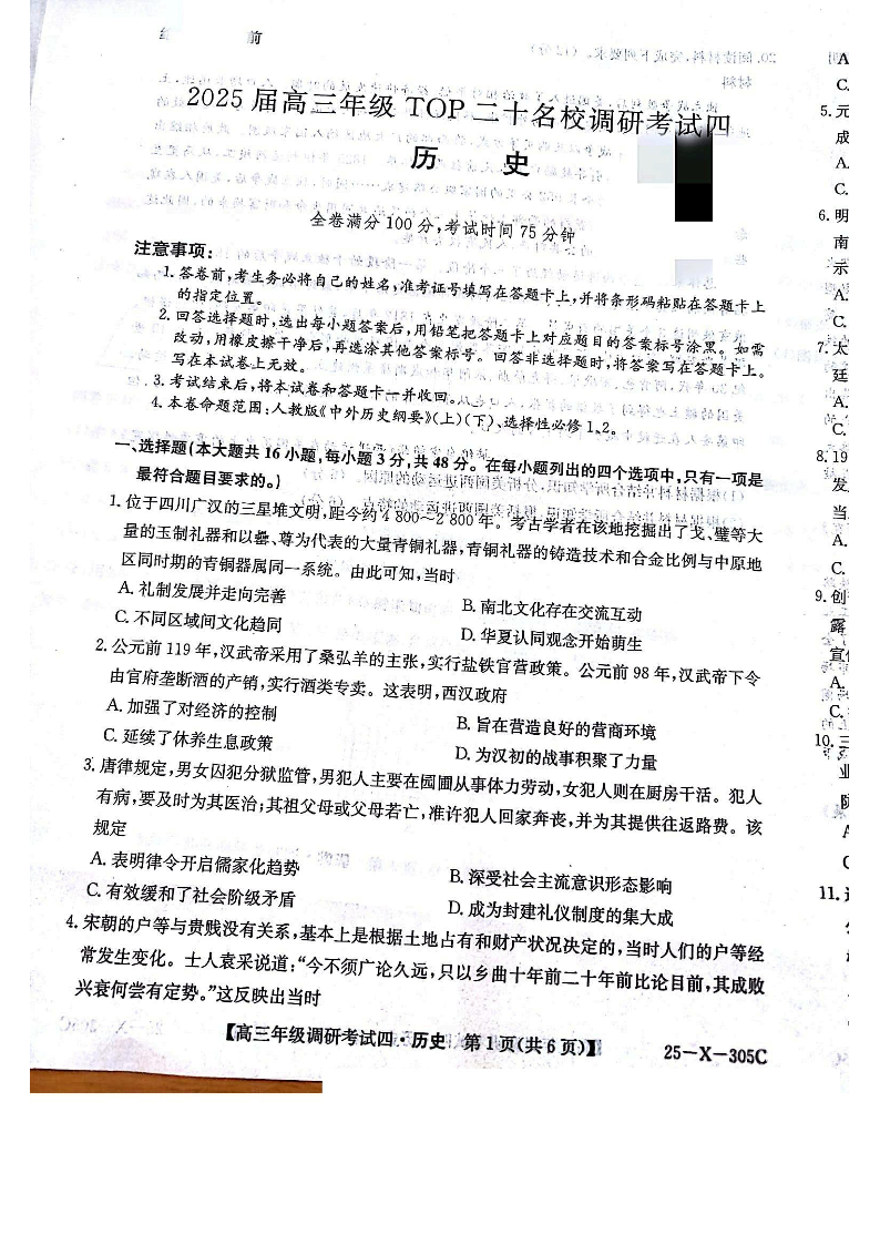 河南省TOP二十名校2025届高三上学期12月调研考试(四)历史