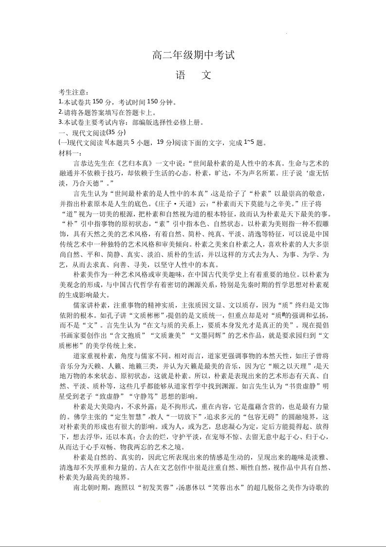 河北省保定市定州市2024-2025学年高二上学期11月期中考试语文