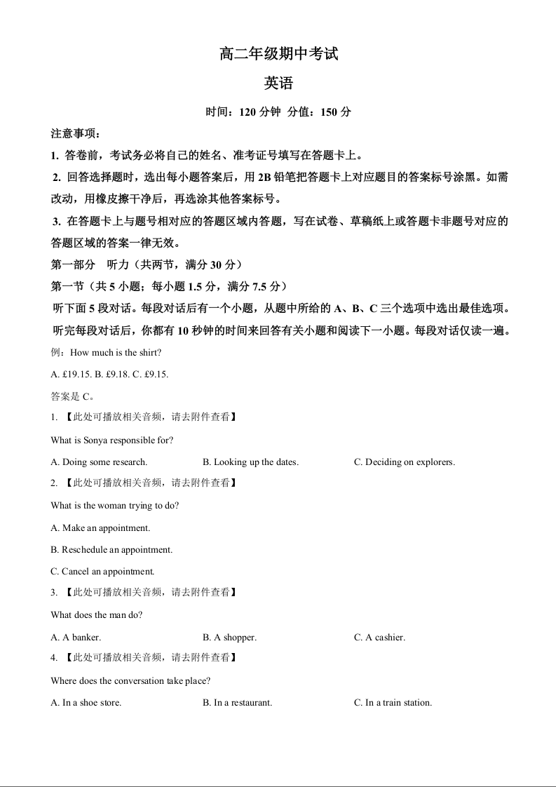 河北省保定市定州市2024-2025学年高二上学期11月期中考试英语(原卷版)