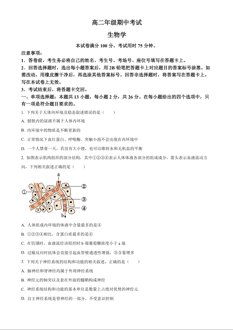 河北省保定市定州市2024-2025学年高二上学期11月期中考试生物(原卷版)