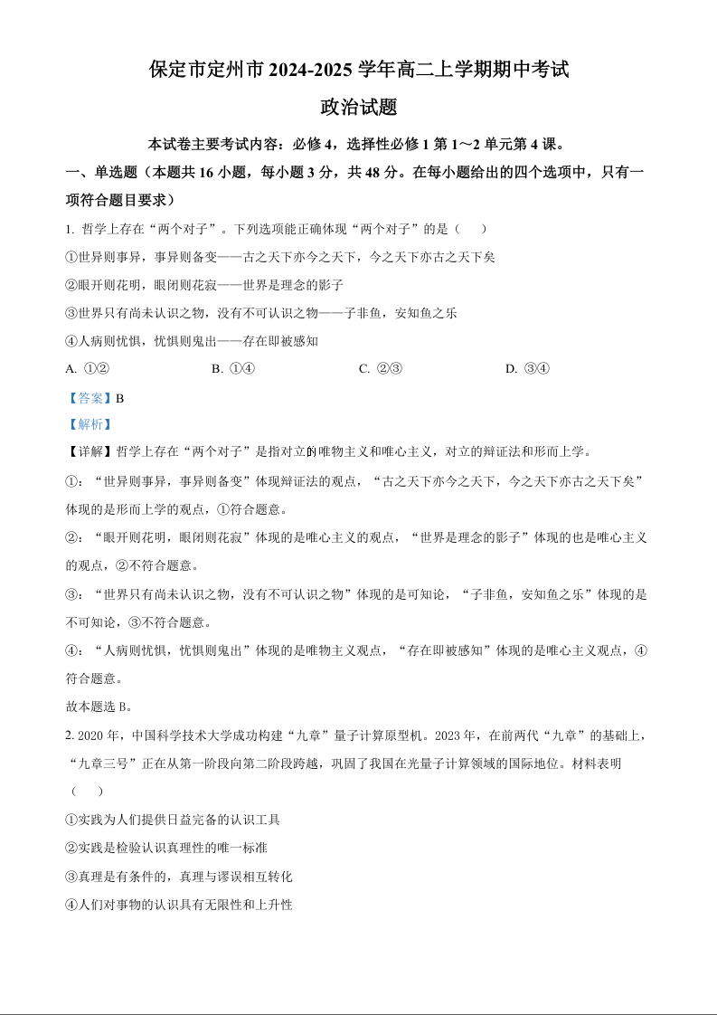 河北省保定市定州市2024-2025学年高二上学期11月期中考试政治(解析版)