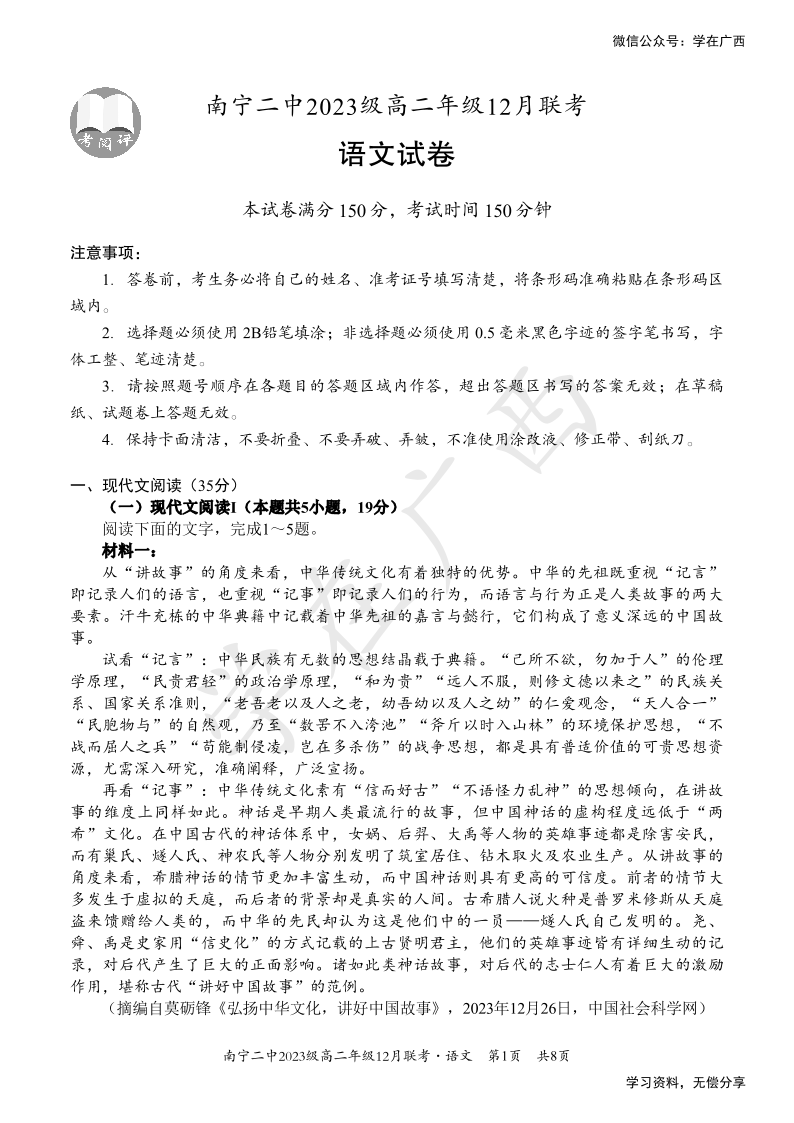 广西省南宁二中等校2024-2025学年高二12月联考语文