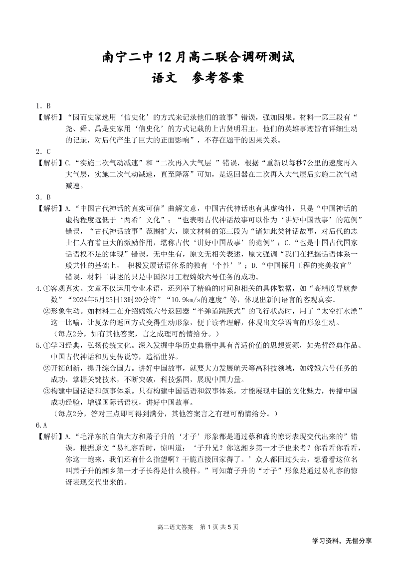 广西省南宁二中等校2024-2025学年高二12月联考语文答案