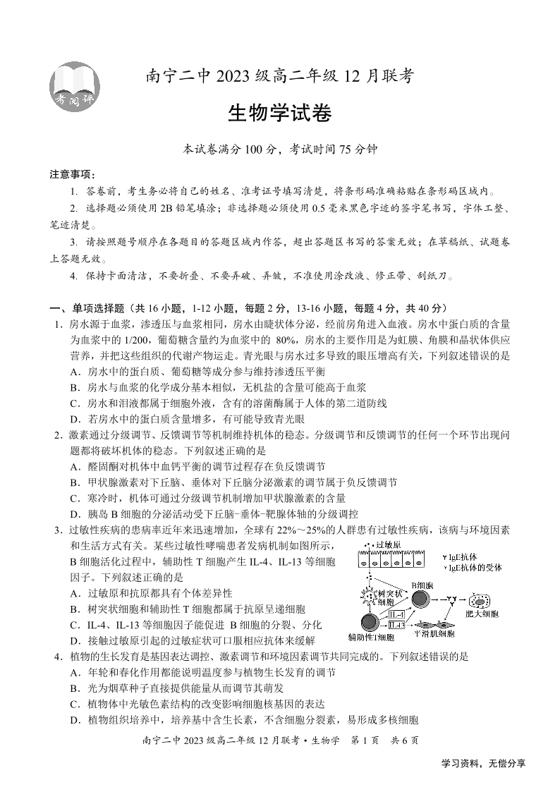 广西省南宁二中等校2024-2025学年高二12月联考生物