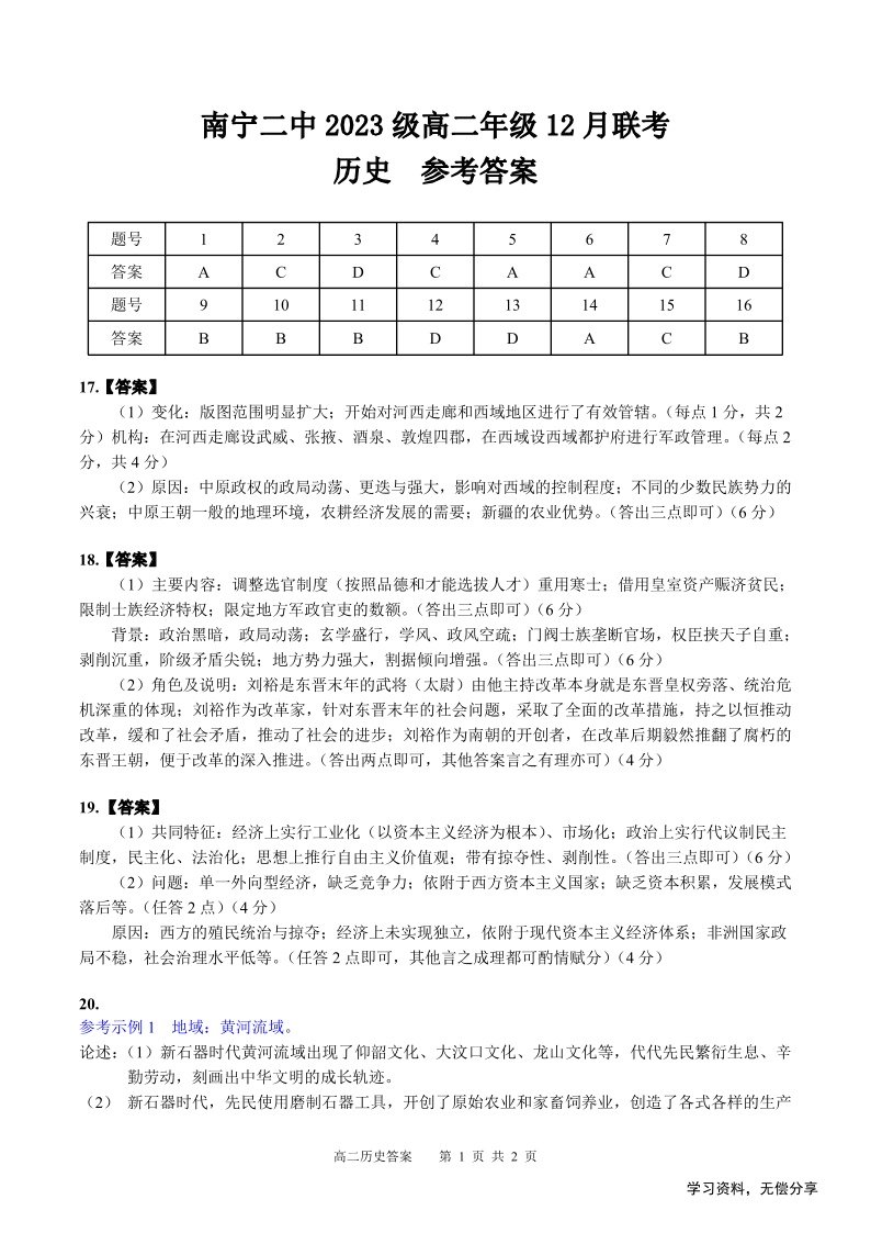 广西省南宁二中等校2024-2025学年高二12月联考历史答案
