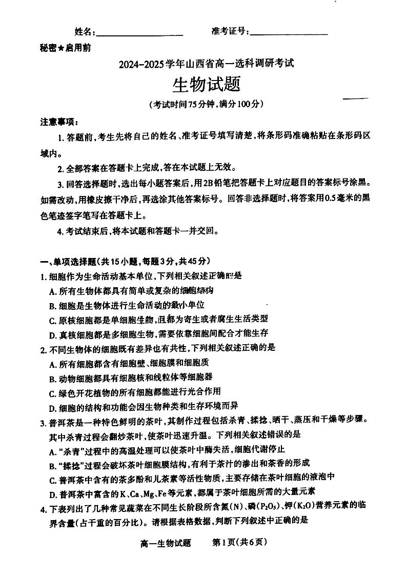 山西省晋城市2024-2025学年高一上学期12月选科调研考试生物试题含答案