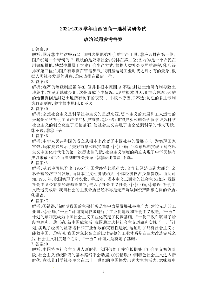 山西省晋城市2024-2025学年高一上学期12月选科调研考试政治答案