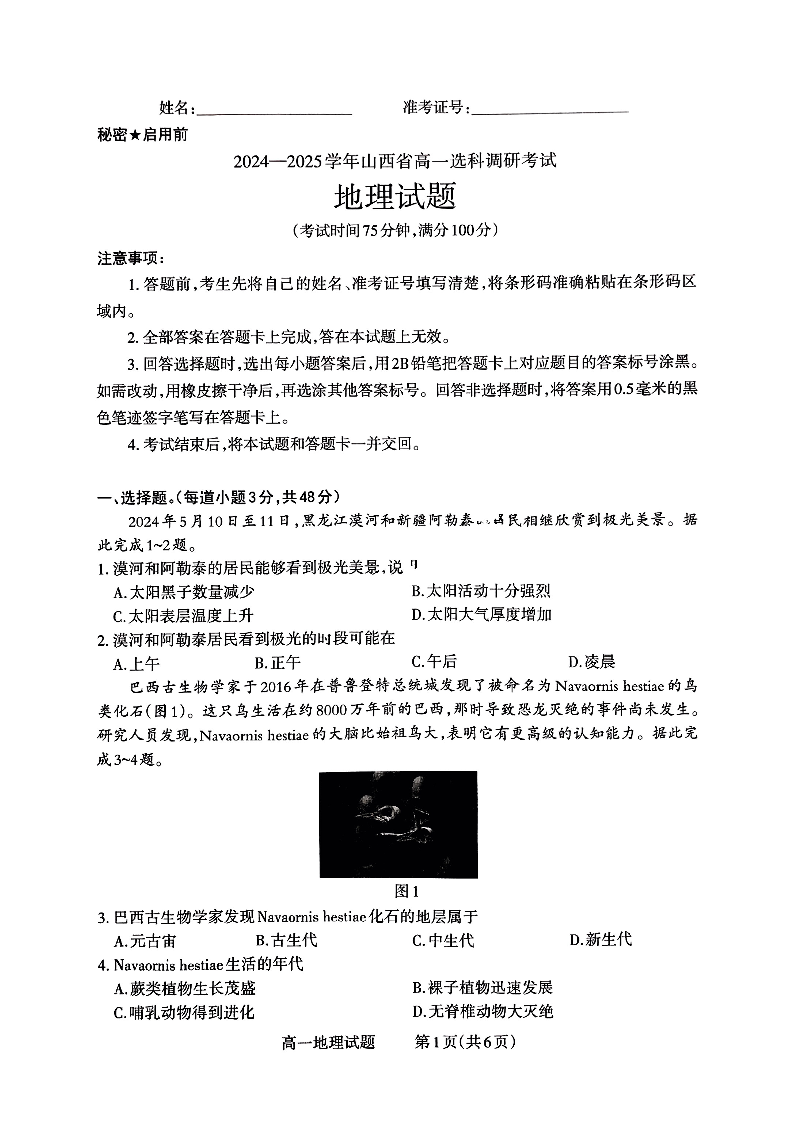 山西省晋城市2024-2025学年高一上学期12月选科调研考试地理试题含答案