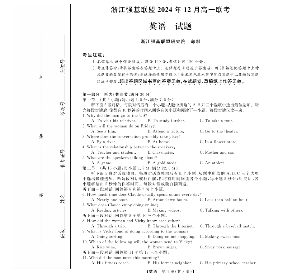 浙江省强基联盟2024-2025学年高一上学期12月联考英语