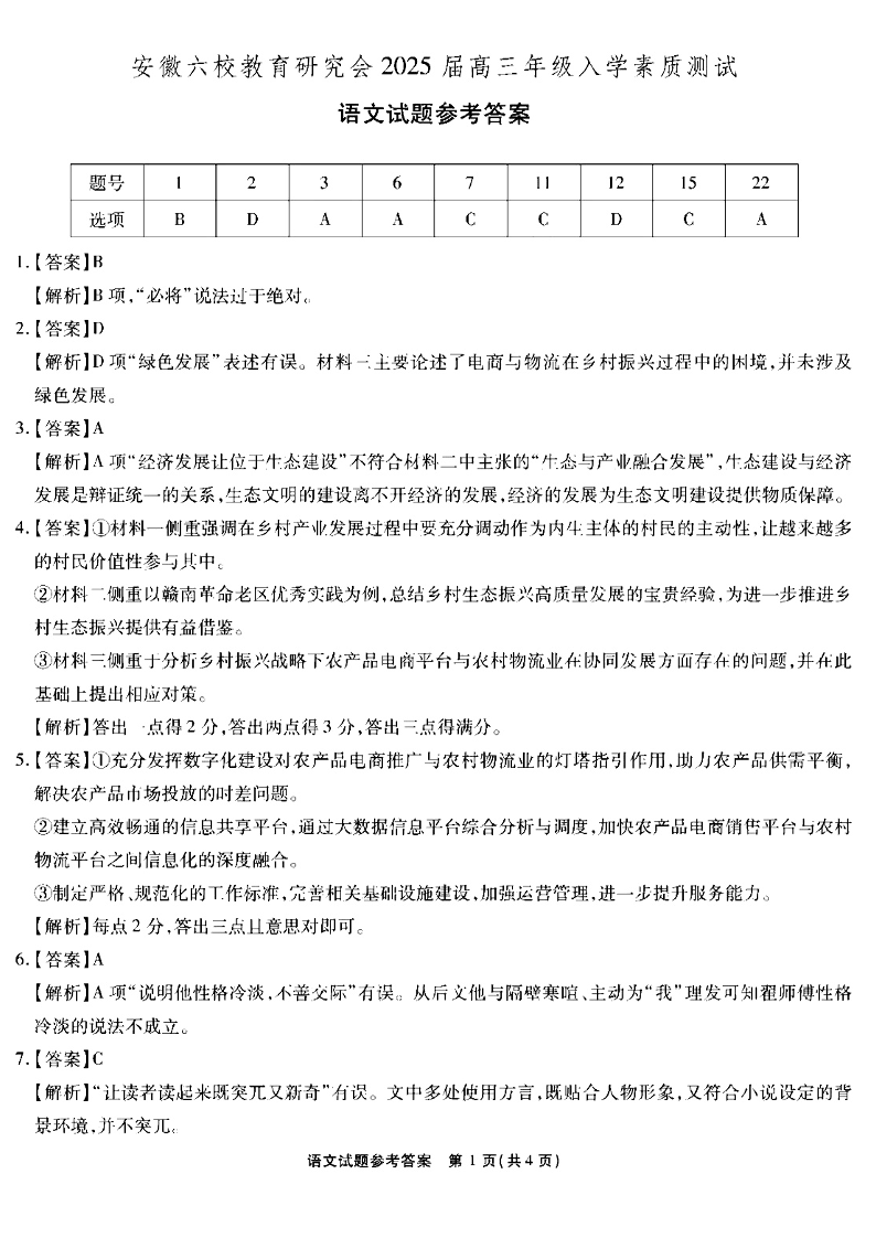 安徽省安徽六校教育研究会2025届高三年级入学素质测试语文答案
