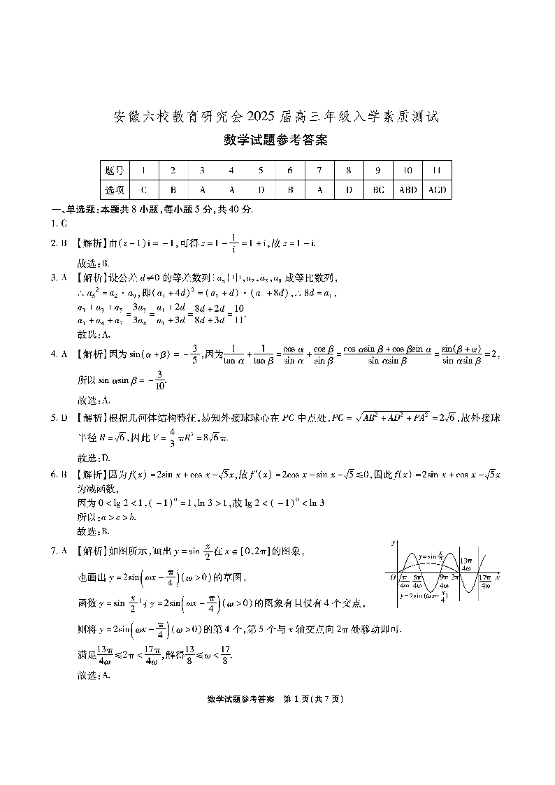 安徽省安徽六校教育研究会2025届高三年级入学素质测试数学答案