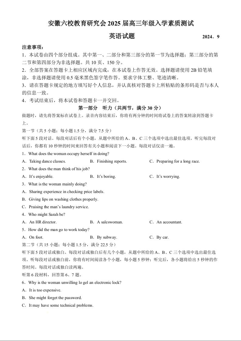 安徽省安徽六校教育研究会2025届高三年级入学素质测试英语试题+答案