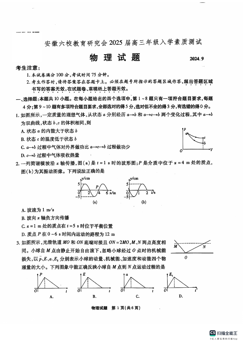 安徽省安徽六校教育研究会2025届高三年级入学素质测试物理试卷