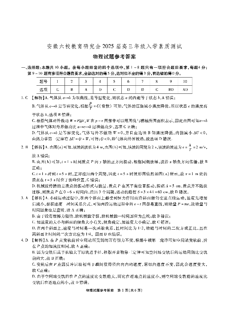 安徽省安徽六校教育研究会2025届高三年级入学素质测试物理答案