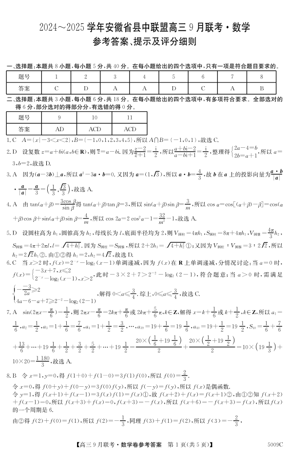 安徽县中联盟2024-2025学年高三9月联考数学答案