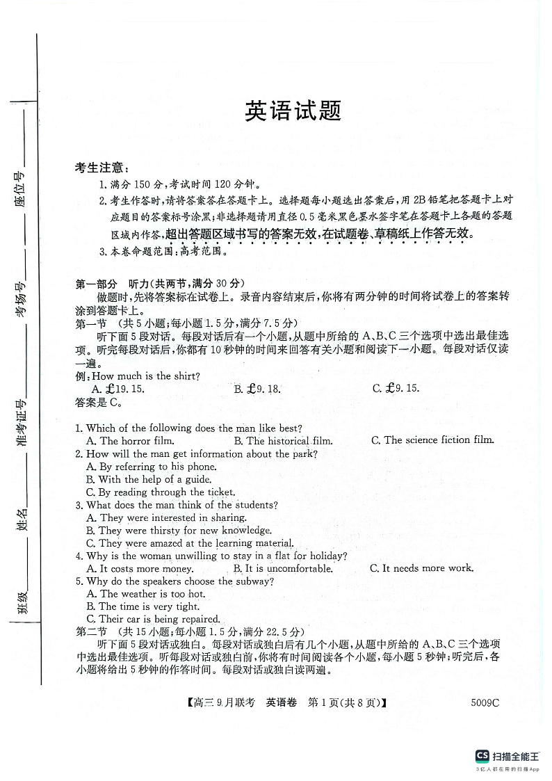 安徽县中联盟2024-2025学年高三9月联考英语试题