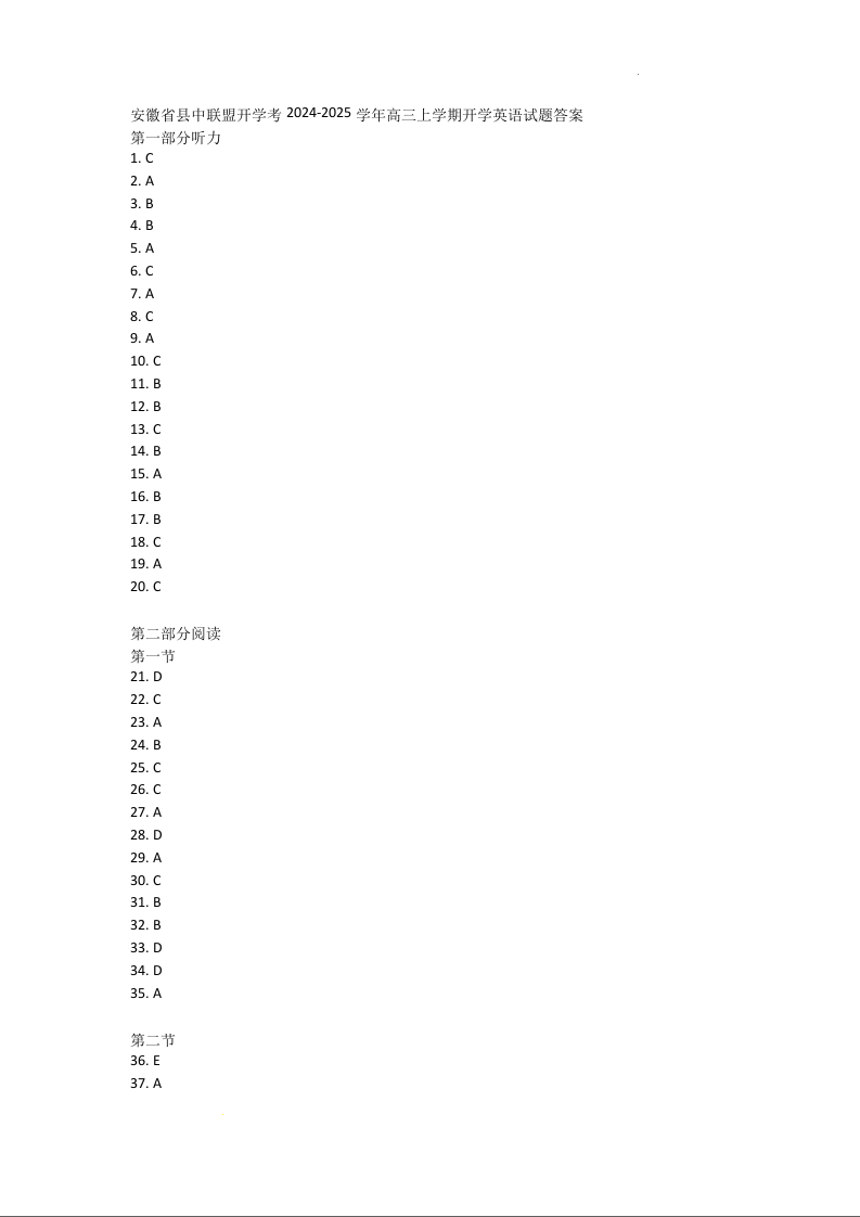 安徽县中联盟2024-2025学年高三9月联考英语答案