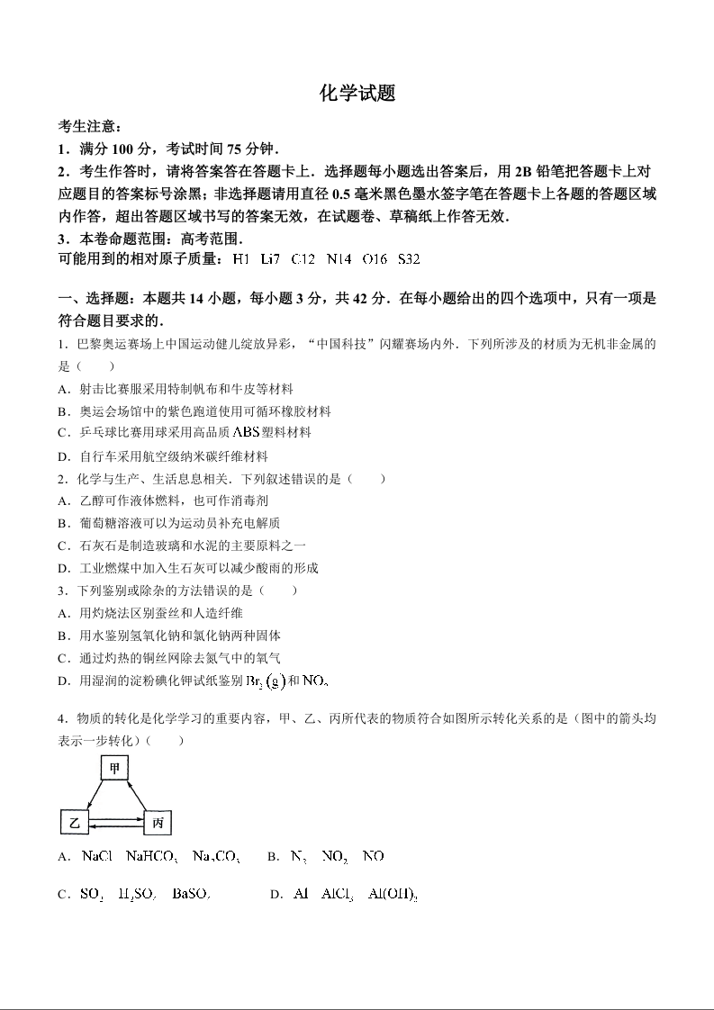 安徽县中联盟2024-2025学年高三9月联考化学试题