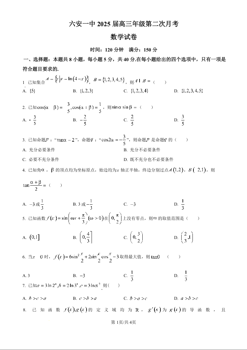 安徽省六安第一中学2025届高三年级第二次月考数学试题(原卷版)