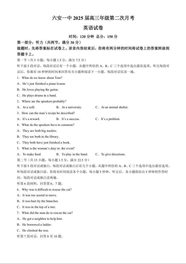 安徽省六安第一中学2025届高三年级第二次月考英语+答案
