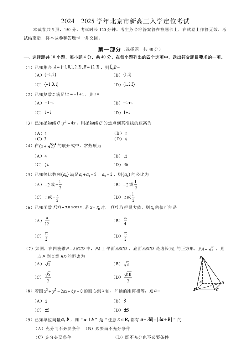 北京市2024-2025学年新高三入学定位考试数学