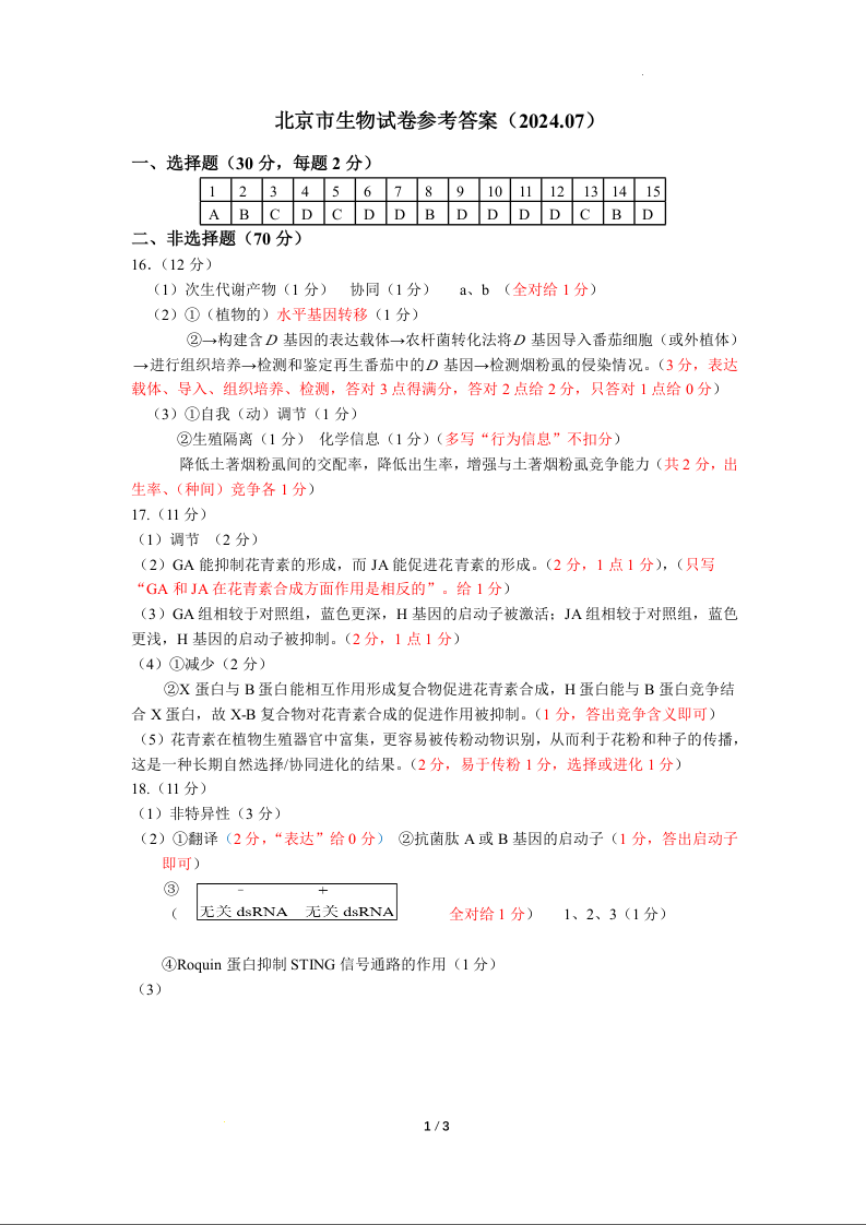 北京市2024-2025学年新高三入学定位考试生物答案