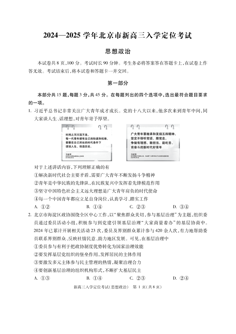 北京市2024-2025学年新高三入学定位考试政治