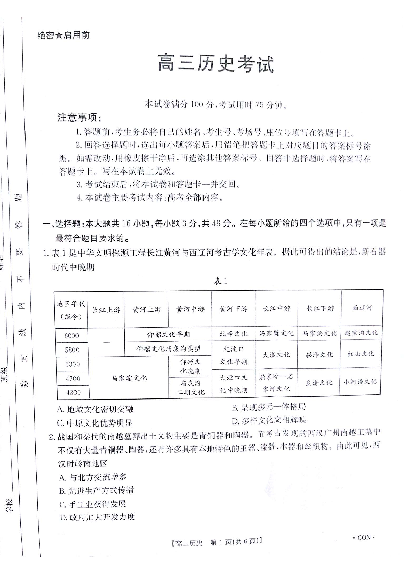 甘肃青海宁夏部分学校2025届高三9月开学大联考历史