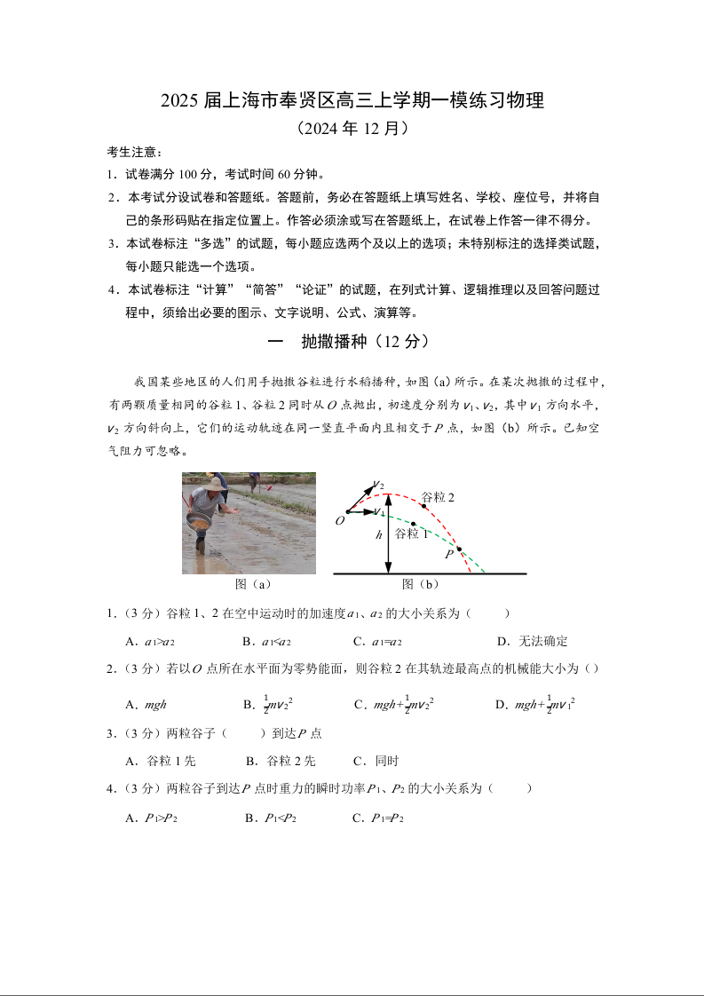 上海市奉贤区2025届高三上学期一模物理+答案