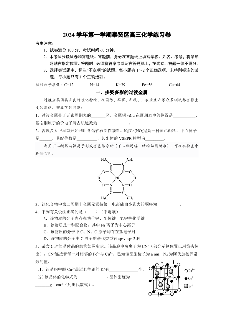 上海市奉贤区2025届高三上学期一模化学
