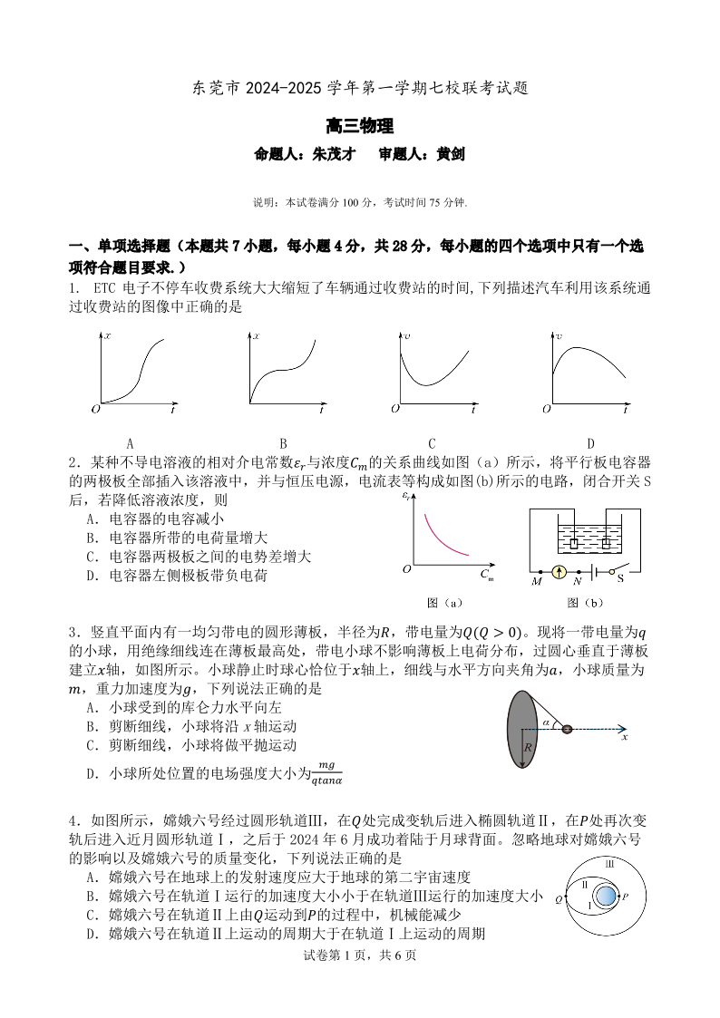 广东省东莞市七校联考2025届高三上学期12月月考物理