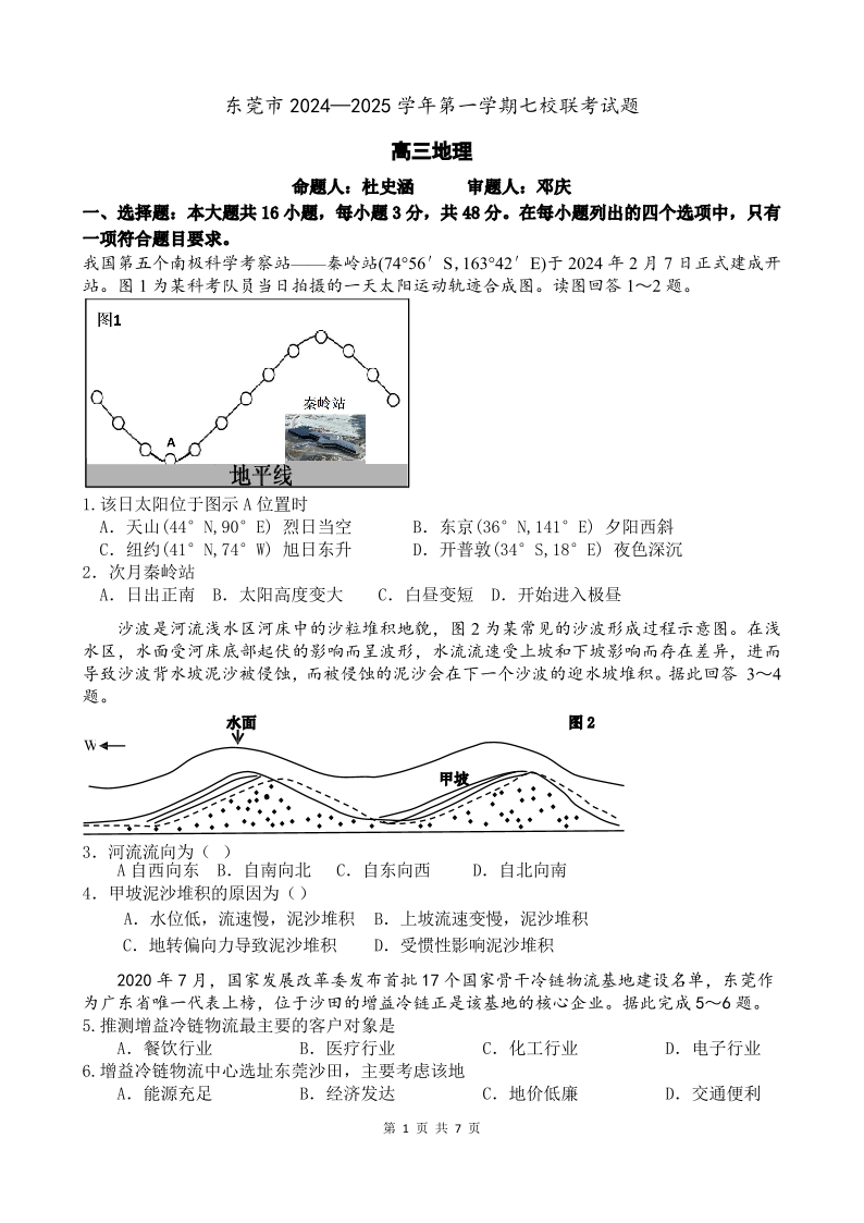 广东省东莞市七校联考2025届高三上学期12月月考地理