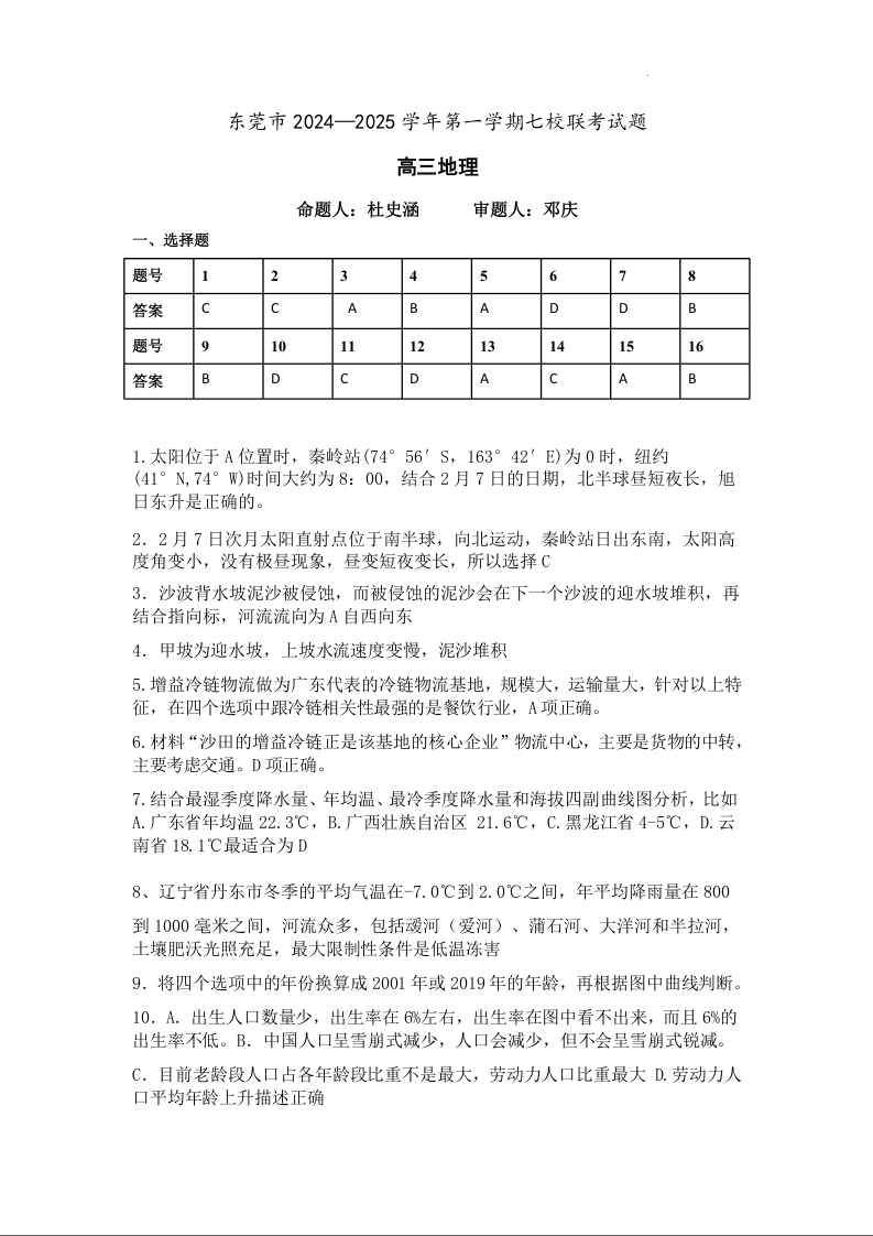 广东省东莞市七校联考2025届高三上学期12月月考地理答案