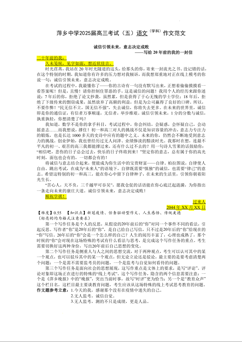 江西省萍乡市萍乡实验2025届高三上学期月考卷(五)作文分析
