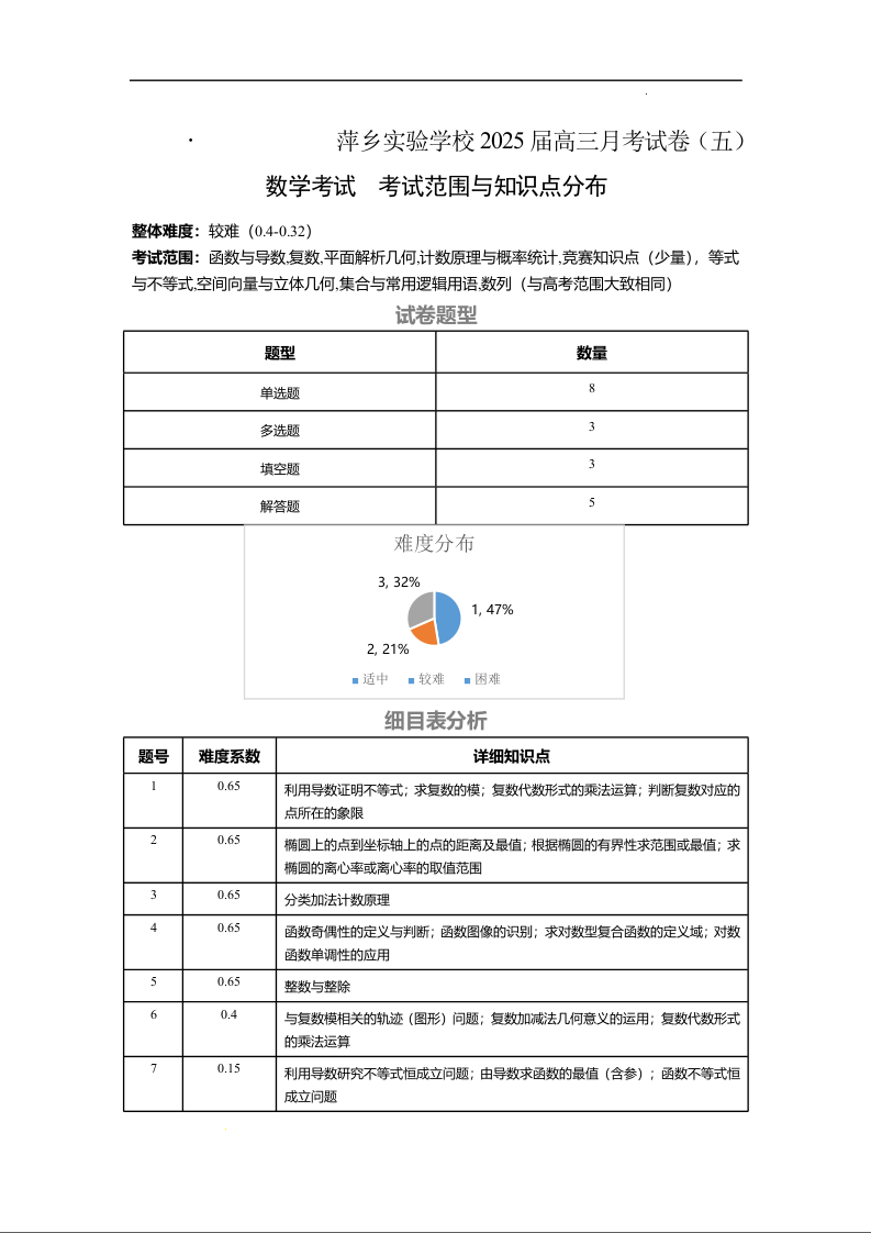 江西省萍乡市萍乡实验2025届高三上学期月考卷(五)数学细目表