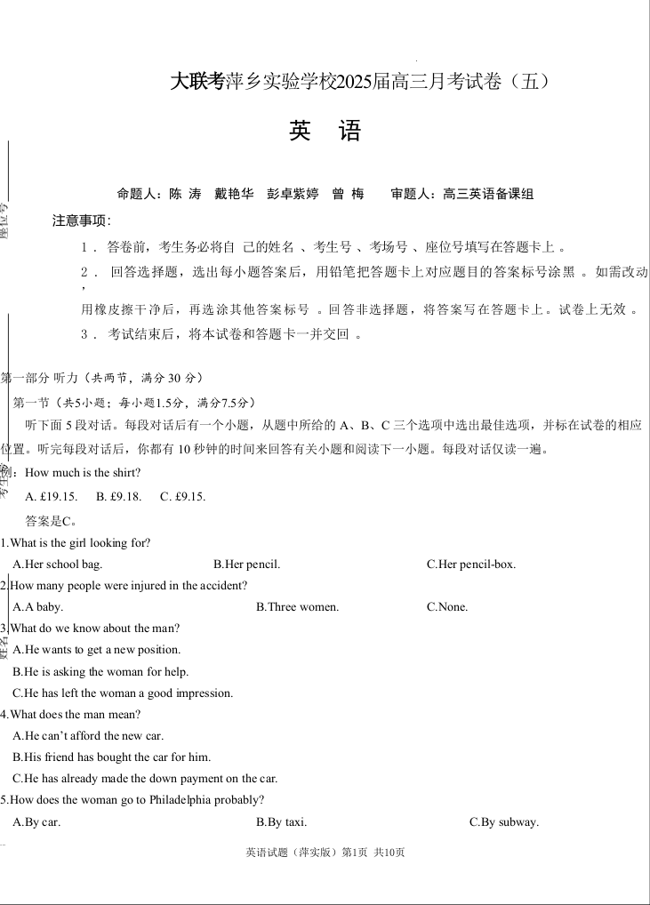 江西省萍乡市萍乡实验2025届高三上学期月考卷(五)英语